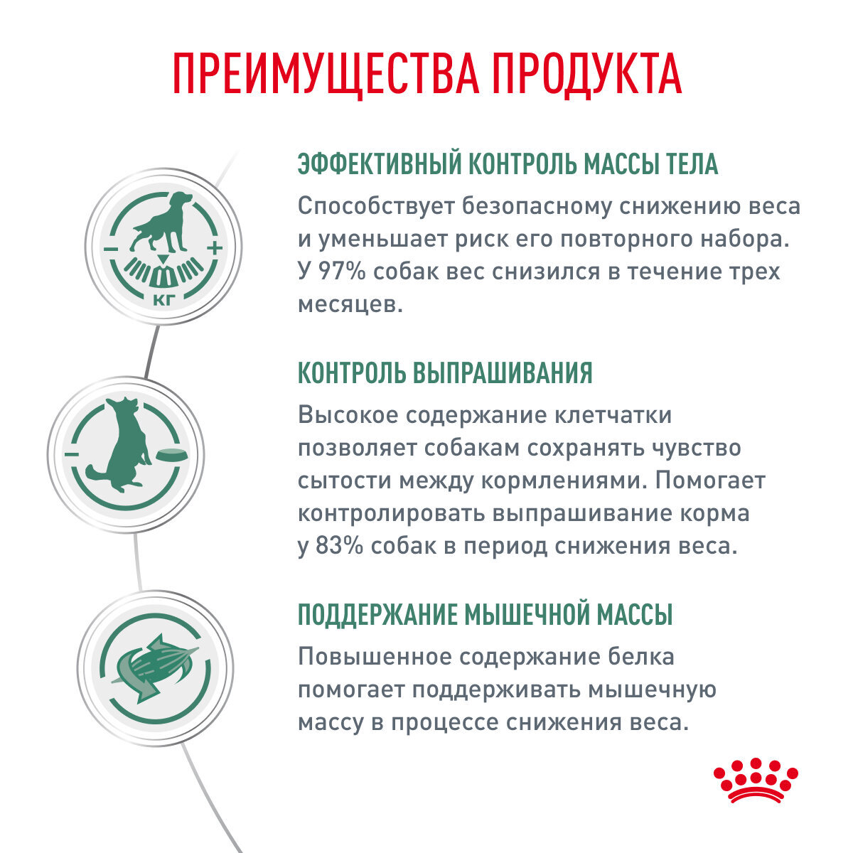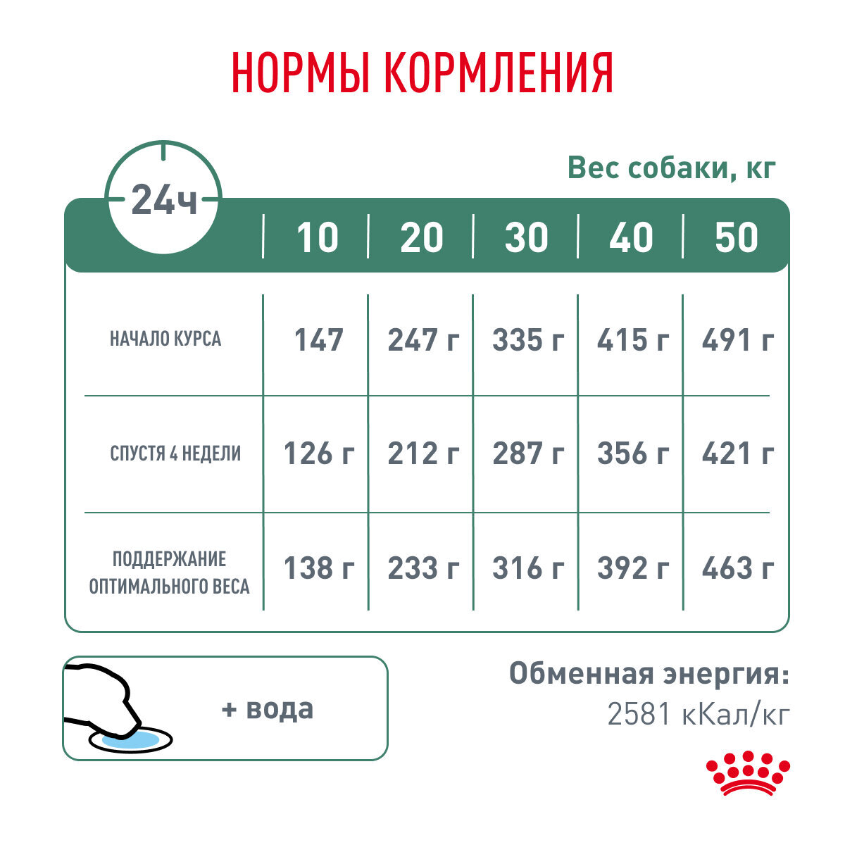 Ветеринарная диета для контроля избыточного веса. Важно! Обратите внимание, производится замена упаковки: артикул 19494 - старая упаковка артикул 38446 - новая упаковка Показания: Ожирение Избыточный вес Гиперлипидемия при избыточном весе Сахарный диабет (при избыточном весе) Поддержание веса в пределах нормы после снижения Противопоказания: Беременность, лактация, рост Хронические заболевания, при которых требуется высококалорийное питание. Длительность курса применения: До назначения диеты необходимо определить, какой вес должна иметь собака в соответствии с индивидуальными особенностями и стандартом породы. В рационной таблице указываются расчетный оптимальный вес. Оптимальное снижение веса: 1–3 % в неделю. Суточный рацион, необходимый для эффективного снижения веса, подбирается индивидуально. Результаты применения диеты следует регулярно контролировать, адаптируя объем порций таким образом, чтобы обеспечить постепенное снижение веса. Суточная норма: необходимый вес (кг) начало курса через 4 недели* поддержание веса 2 44 37 41 4 74 63 69 6 100 85 94 8 124 106 117 10 146 125 138 12 168 144 158 14 188 161 177 16 208 178 196 18 227 195 214 20 246 211 232 25 291 249 274 30 333 286 314 35 374 321 353 40 414 355 390 45 452 387 426 50 489 419 461 60 561 480 529 70 629 539 593 80 696 596 656 90 760 651 716 * Если вес собаки не уменьшается Состав Ингредиенты: растительная клетчатка, дегидратированное мясо птицы, пшеничная клейковина, тапиока, кукурузная клейковина, гидролизат животных белков, кукуруза, пшеница, животные жиры, свекольный жом, рыбий жир, минеральные вещества, фруктоолигосахариды, соевое масло, оболочки и семена подорожника, гидролизат из панциря ракообразных (источник глюкозамина), экстракт бархатцев прямостоячи