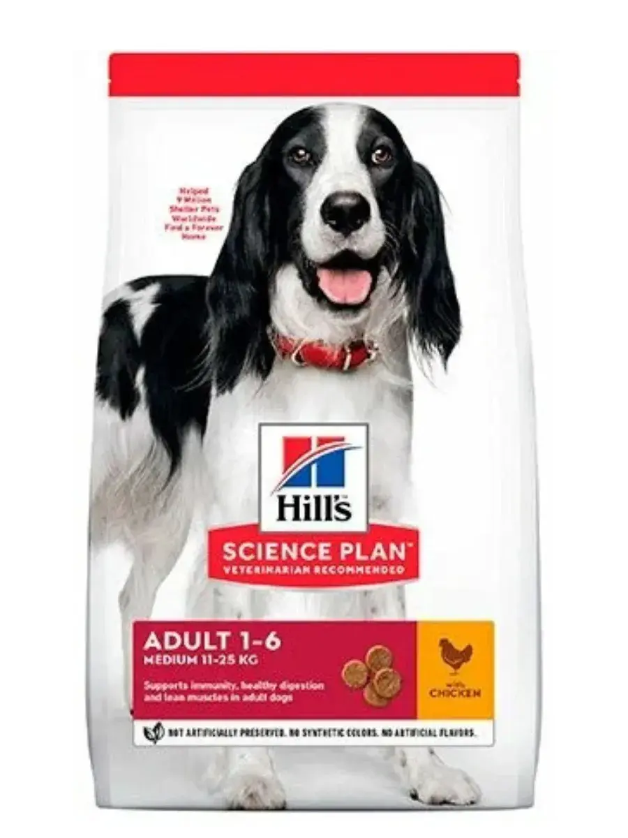 - Сухой корм Hill's Science Plan для взрослых собак средних пород для поддержания иммунитета с курицей. Корм для взрослых собак Hill's Science Plan с курицей специально разработан для обеспечения энергетических потребностей собак в самом расцвете их жизни. Произведено из высококачественных, легко усваиваемых ингредиентов. •Омега-6 жирные кислоты и витамин Е для красивой кожи и шерсти •Высококачественный белок для поддержания мышечной массы •Легко усваиваемые ингредиенты и пищевые волокна для здорового пищеварения. Сухой корм для взрослых собак для долгой и счастливой жизни. Никто вас не встретит так, как ваша собака, – виляя хвостом и облизывая ваше лицо. Каждый момент, который вы проводите вместе, особенный, и мы стремимся подарить вам больше таких моментов. С качественными ингредиентами и правильно подобранными питательными веществами, Hill's Science Plan разработан именно для того, чтобы предложить вашей собаке корм, необходимый для здоровья и счастья на протяжении всей жизни. Мы производим наш корм для собак из высококачественных ингредиентов. Все ингредиенты в составе сухого корма должны соответствовать нашим строгим и превосходящим отраслевые стандарты требованиям к чистоте и содержанию питательных веществ. Состав: Кукуруза, пшеница, мука из курицы и индейки, животный жир, гидролизат белка, мука из кукурузного глютена, растительное масло, минералы, сухая пульпа сахарной свеклы, семя льна. Содержание мяса: курица 9%, общее содержание домашней птицы 14% питательные вещества: Белок 21,1%, Жир 14,8%, Клетчатка 1,6%, Омега-6 жирные кислоты 3,4%, Зола 4,7%, Кальций 0,70%, Фосфор 0,63%, Натрий 0,27%, Калий 0,71%, Магний 0,09%; на кг: Витамин А 10 591МЕ, Витамин D3 722МЕ, Витамин E 550мг, Витамин С 90мг, Бета-каротин 1,5мг. Добавки на КГ: 3b103 (Железо) 84,7мг, 3b202 (йод) 2,4мг, 3b405 (медь) 8,4мг, 3b502 (Марганец) 8,8мг, 3b603 (цинк) 155мг, 3b801 (Селен) 0,1мг; с натуральным антиоксидантом. Калорийность: Ккал/100г: 372.