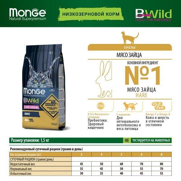 Monge (Монж) Cat BWild LOW GRAIN (холистик) полнорационный низкозерновой корм из мяса зайца для взрослых кошек и котов 1,5 кг.