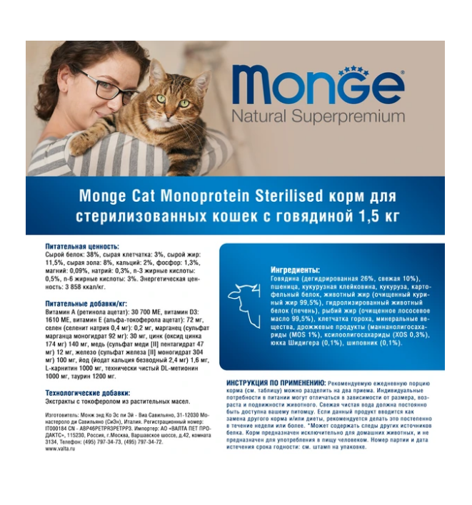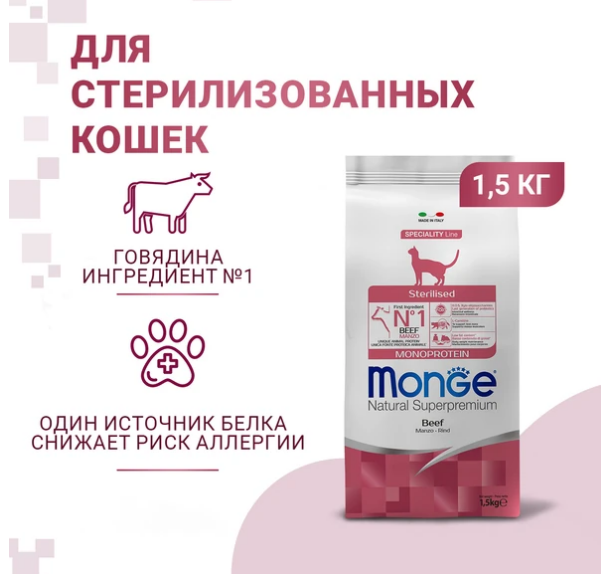 Monge (Монж) Cat Speciality Line Monoprotein сухой корм из мяса говядины для стерилизованных кошек и кастрированных котов 1,5 кг.