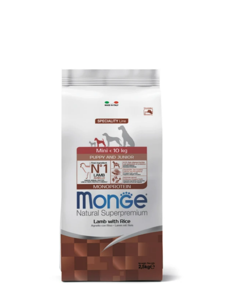 Monge (Монж) Dog Speciality Line Monoprotein Puppy & Junior Mini сухой корм из мяса ягнёнка с рисом для щенков мелких пород 2,5 кг.