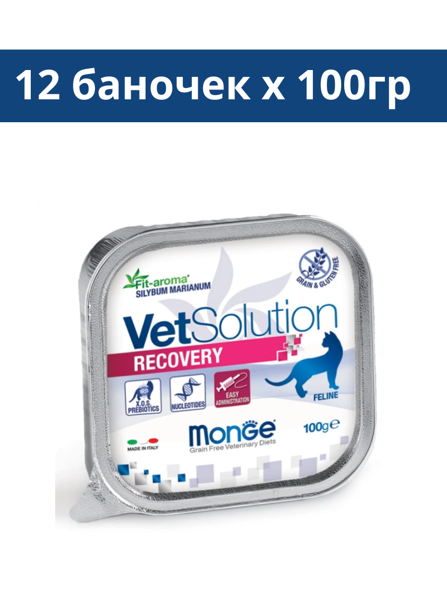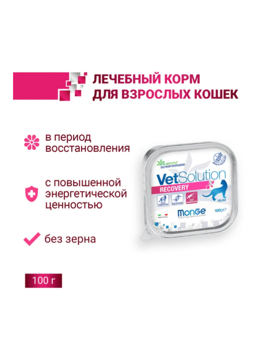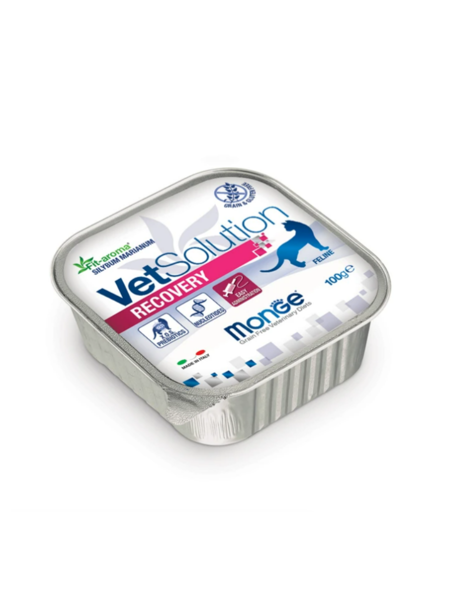 Лечебный корм Monge (Монж) VetSolution Cat Recovery Рекавери для кошек при восстановлении питания в период выздоровления, а так же анорексии, кахексии, отсутствия аппетита, при поддержке процесса восстановления при раковых заболеваниях и тяжелых травмах.