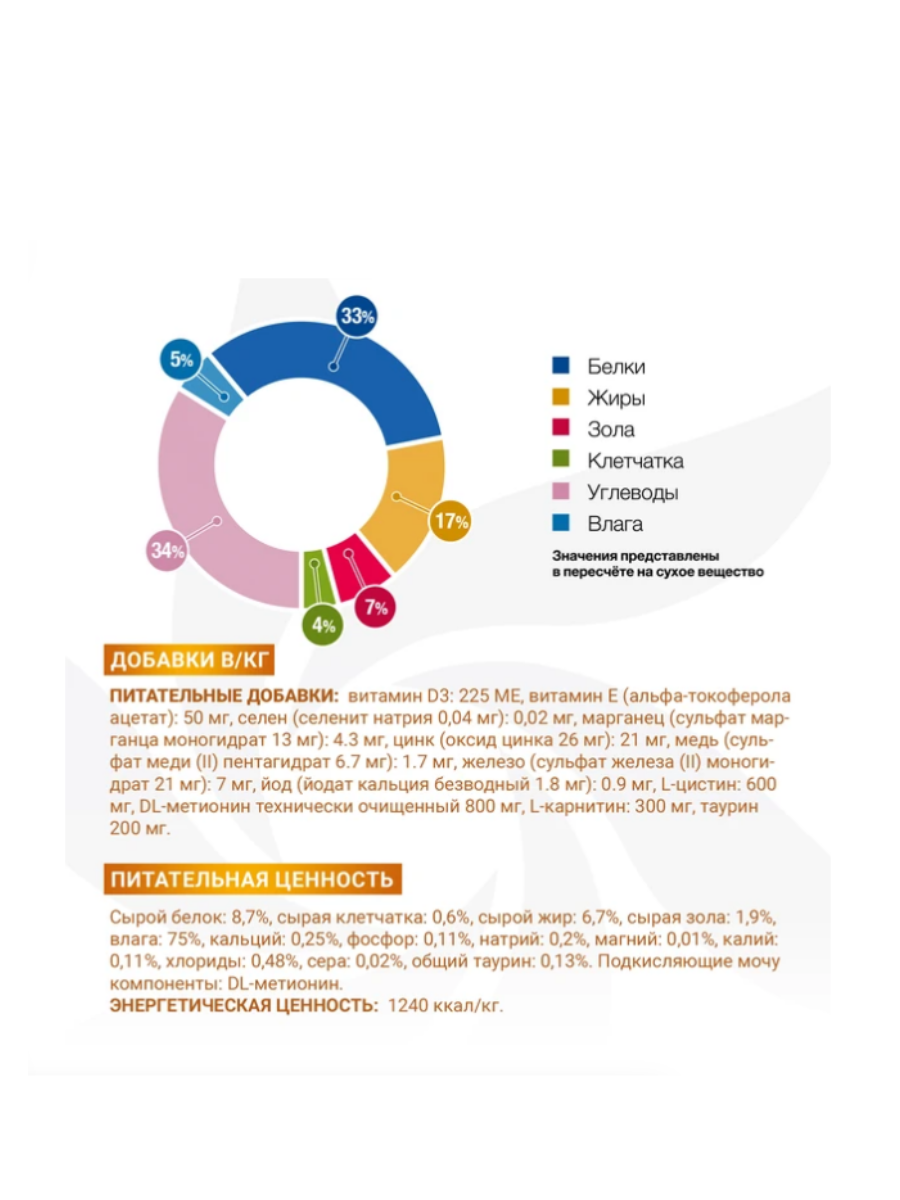 В состав корма входят высококачественные ингредиенты, которые обеспечивают сбалансированное питание с учетом потребностей животных. Формула направлена на снижение уровня минералов, способствующих образованию струвитов, что немаловажно для здоровья вашей кошки.