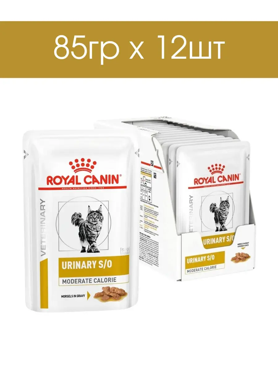 Royal Canin для кошек влажный urinary moderate calorie 85г - это влажный корм для растворения камней или исчезновения симптомов мочевой инфекции требуется применение диеты в течение 4-12 недель. В случае инфекции минимальный срок назначения рациона Urinary S/O moderate calorie в комплексе с антибиотиком составляет еще минимум месяц после получения отрицательного бактериологического анализа мочи.