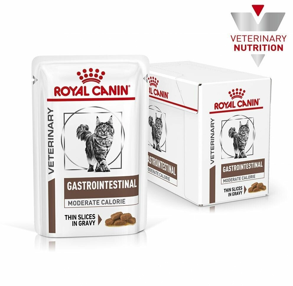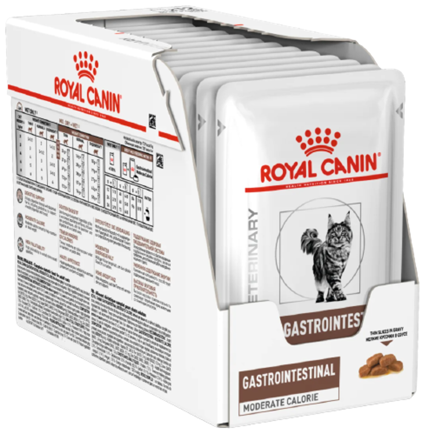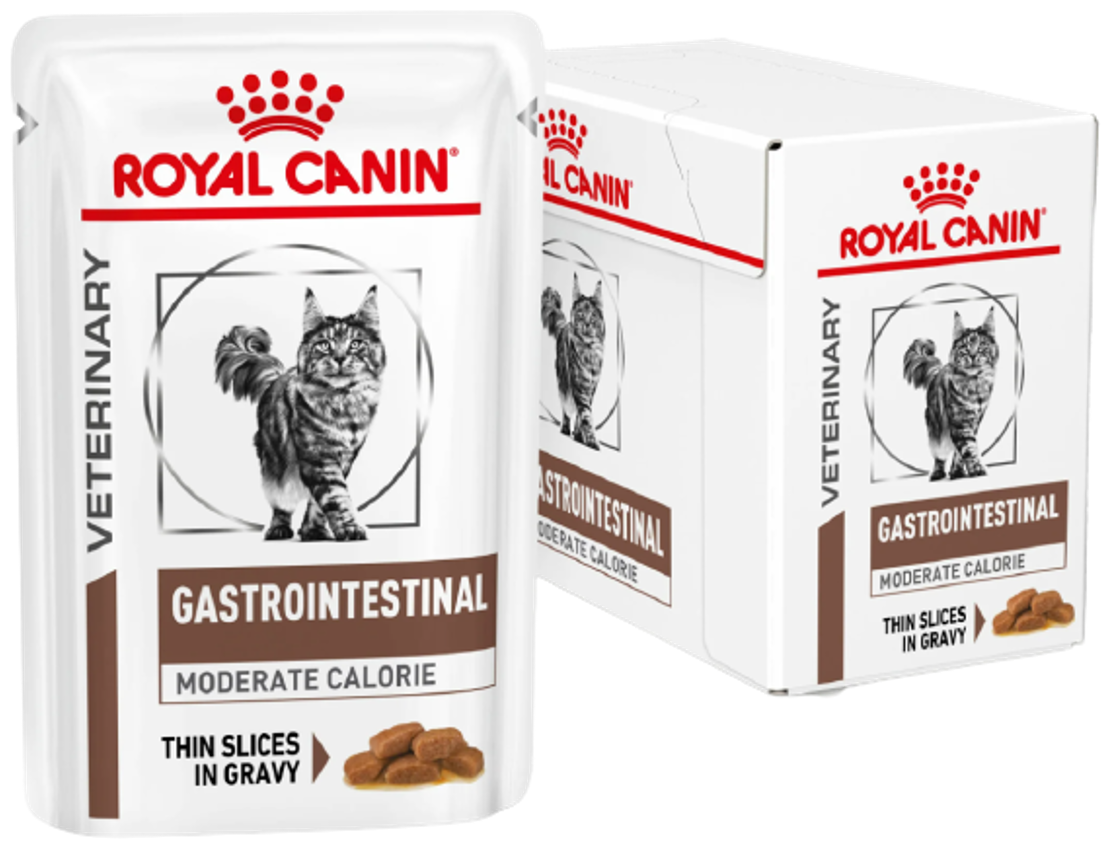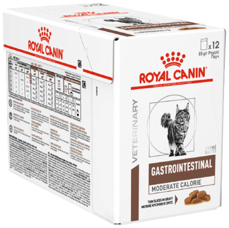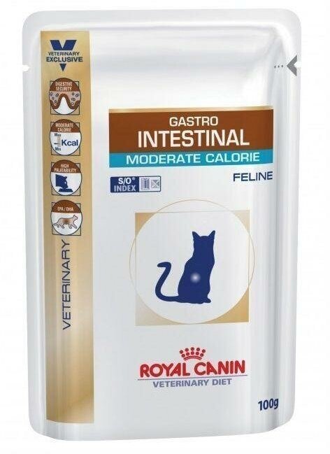 Корм консервированный полнорационный диетический для взрослых кошек Royal Canin Gastrointestinal Moderate Calorie (мелкие кусочки в соусе) – это полнорационный диетический корм для кошек, рекомендуемый при расстройствах пищеварения и для нормализации работы пищеварительной системы. Легкоусвояемые ингредиенты. Повышенное содержание электролитов. Пониженный уровень жиров. Рекомендации: Посоветуйтесь с вашим ветеринарным врачом по поводу целесообразности использования данного корма. Применяйте корм Gastrointestinal Moderate Calorie (мелкие кусочки в соусе) в течение не менее 1-2х недель при острой диарее и в период восстановления. При синдроме недостаточности пищеварения – от 3 до 12 недель, при хронической экзокринной недостаточности поджелудочной железы – пожизненно. Корм готов к употреблению. Проследите, чтобы у вашей кошки всегда была свежая вода.