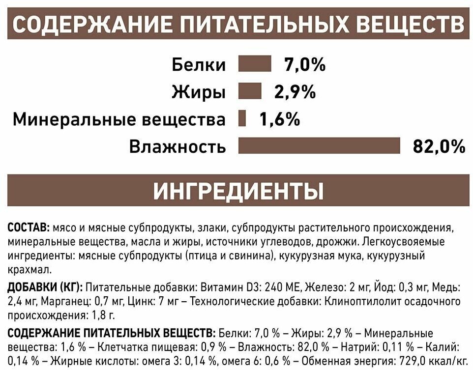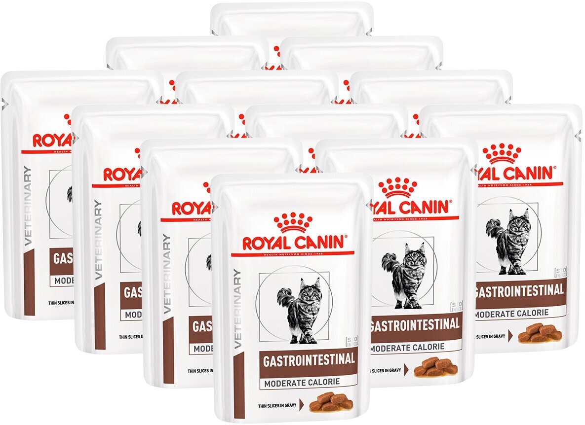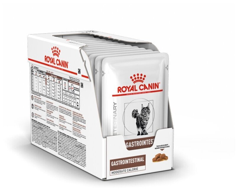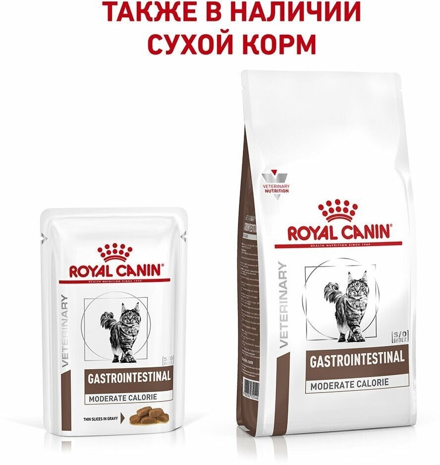 Корм консервированный полнорационный диетический для взрослых кошек Royal Canin Gastrointestinal Moderate Calorie (мелкие кусочки в соусе) – это полнорационный диетический корм для кошек, рекомендуемый при расстройствах пищеварения и для нормализации работы пищеварительной системы. Легкоусвояемые ингредиенты. Повышенное содержание электролитов. Пониженный уровень жиров. Рекомендации: Посоветуйтесь с вашим ветеринарным врачом по поводу целесообразности использования данного корма. Применяйте корм Gastrointestinal Moderate Calorie (мелкие кусочки в соусе) в течение не менее 1-2х недель при острой диарее и в период восстановления. При синдроме недостаточности пищеварения – от 3 до 12 недель, при хронической экзокринной недостаточности поджелудочной железы – пожизненно. Корм готов к употреблению. Проследите, чтобы у вашей кошки всегда была свежая вода.